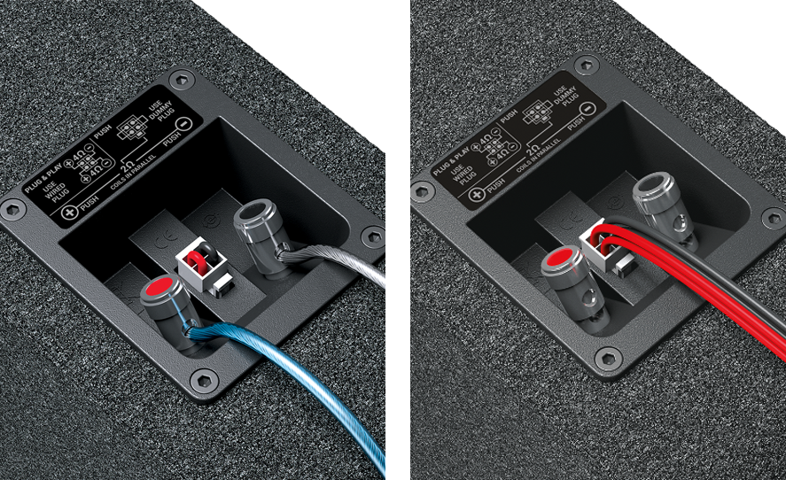 Клеммная колодка SSP в корпусе имеет как традиционные нажимные контакты, так и разъем Plug-&-Play. При использовании нажимных контактов полное сопротивление устанавливается на самое низкое значение с помощью входящего в комплект мостового соединителя, вставленного в клеммную колодку Plug-and-Play (Audison APBX 10 DS / 8DS = 2 Ом, Audison APBX 8 R = 4 Ом). Разъем «Plug-and-Play» настраивает полное сопротивление в соответствии с требованиями и обеспечивает быстрое расцепление, если корпус необходимо снять, и защищает от коротких замыканий. Для облегчения объединения корпусов Audison APBX с усилителями Audison AP предусмотрена серия специальных жгутов Plug-and-Play.