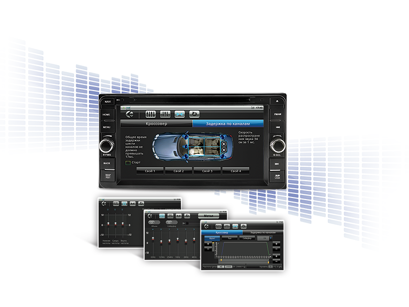 - функция «Кроссовер» с тремя фильтрами частот для каждой группы динамиков, а также фильтром низких частот для сабвуфера, с переключателем фазы. В каждом фильтре доступна регулировка уровня и настройка частоты среза с точностью до одного Герца. Такой серьезный инструмент позволит достичь завораживающей чистоты звука. Но самое главное – без него практически невозможно обойтись, поскольку под любой автомобиль обязательно нужно «донастроить» звук. Оригинальный (штатный) магнитофон автомобиля имеет запрограммированные с завода кроссоверы под установленный в авто набор акустики. При замене штатной магнитолы на любое другое головное устройство нужно применить срез частот, и настроить новый мультимедийный центр под вашу акустику. Если таких настроек нет, динамики будут «запирать» и «хрипеть», независимо от уровня и стоимости головного устройства. Это связано с тем, что на все динамики будет «отправляться» весь спектр частот, в то время как они не весь умеют играть.