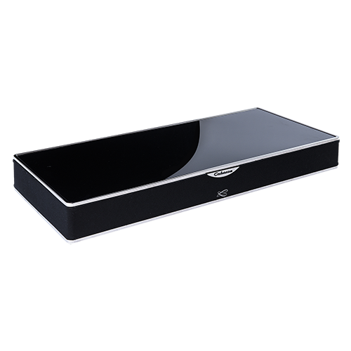 Stream Base - это красиво оформленный продукт, который пропитан французскую изящество. Стеклянная верхняя панель и серебряная отделка элегантно сочетаются с черной решеткой (передняя и боковая стороны). Он имеет толстые опоры с серебряными накладками. На передней панели есть логотипы Cabasse. Текстовый дисплей светит через решетку и предоставляет полезные обновления.