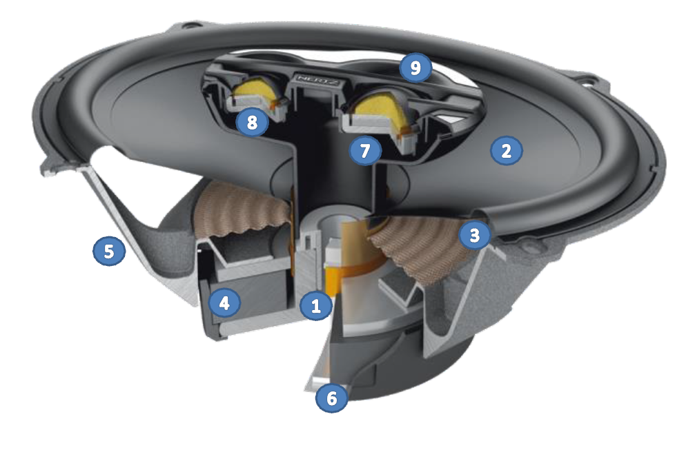 1.Звуковая катушка НЧ-динамика из чистой меди размером 38 мм: намотанная на полиамид для выдающейся мощности и динамического сжатия-воспроизведения.