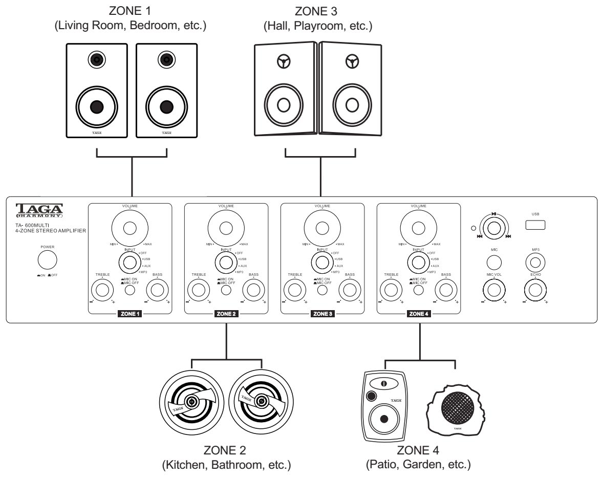 Один усилитель TA-600MULTI может создавать экономичную многоканальную аудиосистему и воспроизводить музыку в четырех зонах с трех входов - кроме того, каждый из них будет иметь независимые настройки звука (включая громкость) для каждой зоны.