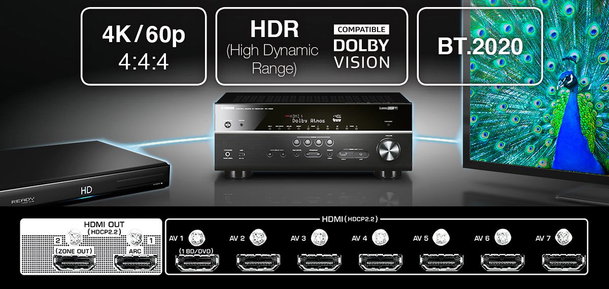 С RX-A1070 вы не просто получаете разъемы HDMI, которые проходят через UHD 4K, вы также получаете встроенное масштабирование 4K. Это означает, что при условии, если у вас есть телевизор UHD 4K, все ваши источники видео высокой четкости можно просматривать до 4K. Ресивер также имеет восемь входов HDMI. Разъемы совместимы с HDR10, Dolby Vision, HLG, HDCP2.2 и BT.2020 для полной совместимости с форматами и источниками HD.
