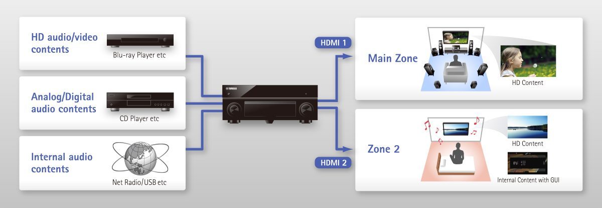 Как и другие модели в диапазоне, Yamaha RX-A1070 имеет второй выход HDMI. Однако, когда все идет лучше, нужно сделать это полностью независимым. Переключение зон позволяет вам смотреть и слушать один источник в комнате, а второй - в другой комнате. Вторая зона также может использовать выделенные предусилители или громкоговорители для полной независимости. Дальнейшие бонусы включают Zone Extra Bass и эквалайзер громкости зоны для индивидуального звучания во второй зоне.