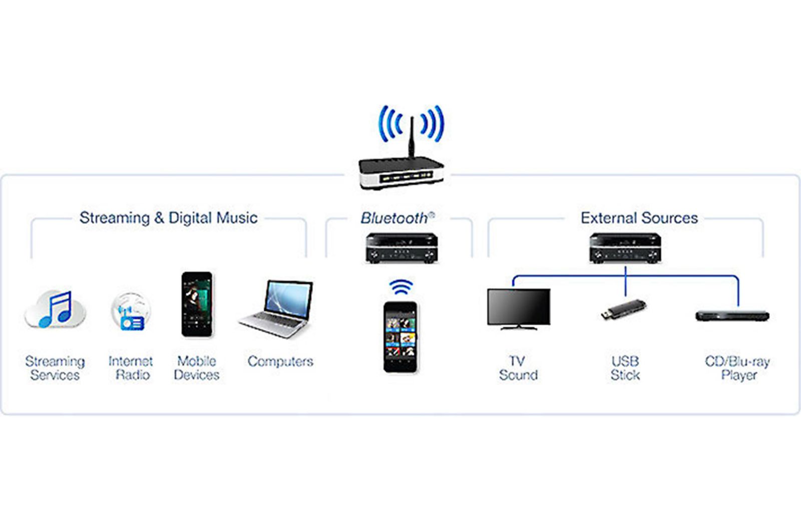 Сервис Spotify Connect позволяет воспроизводить музыкальную библиотеку в Spotify через ресивер с помощью смартфона или планшета (требуется приложения Spotify и премиум подписка)