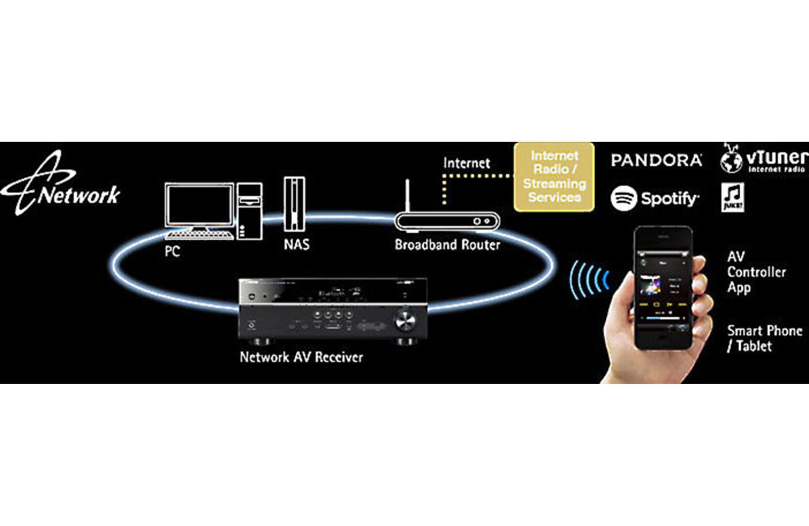 Сервис Spotify Connect позволяет воспроизводить потоковую музыкальную библиотеки в Spotify через ресивер с помощью смартфона или планшета (требуется приложения Spotify и премиум подписка)